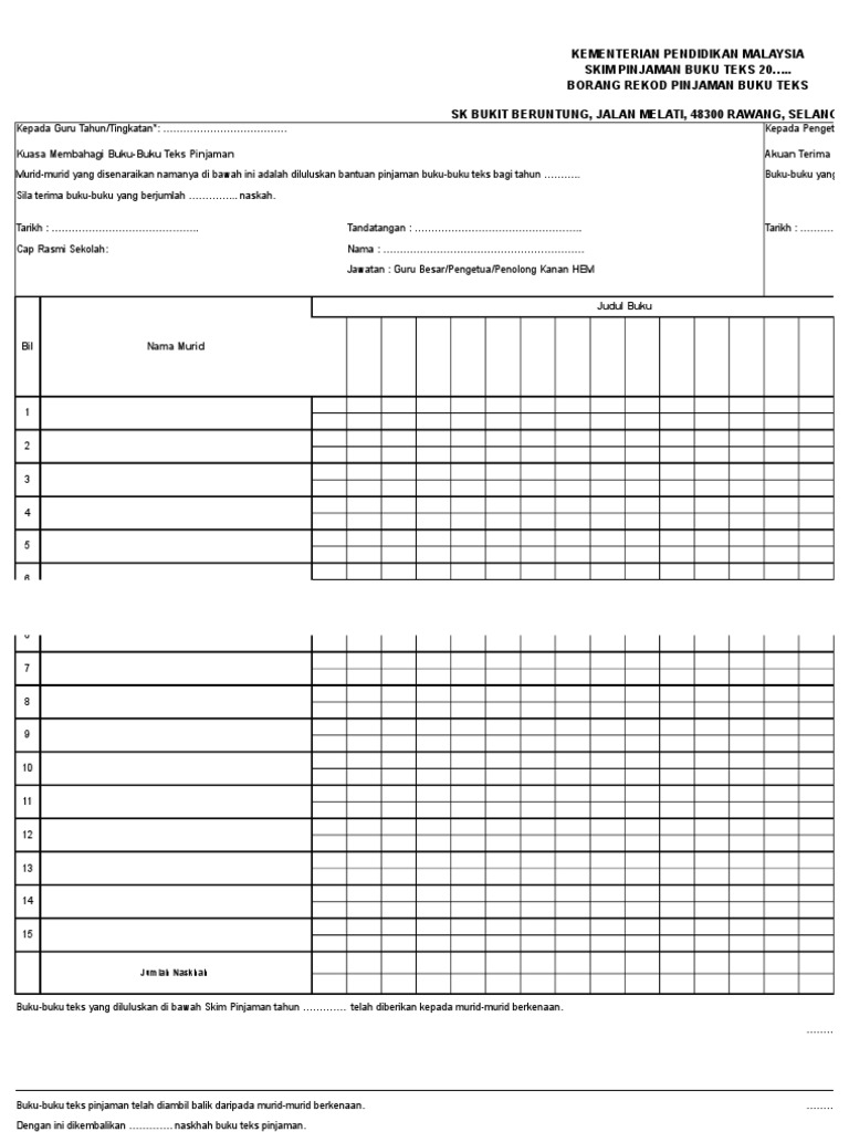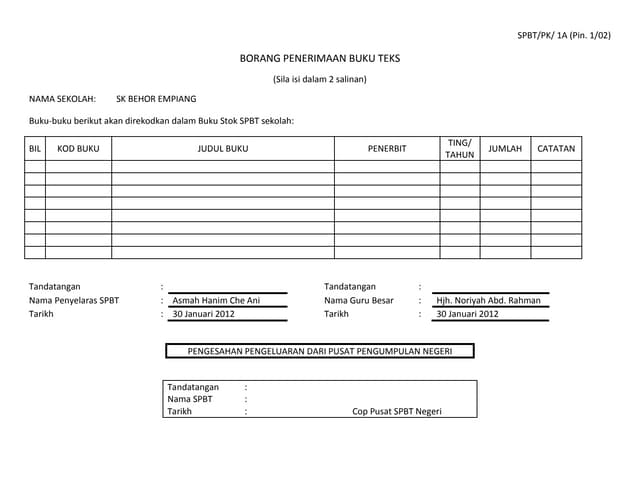 Borang peminjaman dan pemulangan peralatan. Berdasarkan borang analisis yang b. Melengkapkan jumlah buku teks mengikut senarai buku teks yang telah disediakan, membalut buku teks dengan plastik lutsinar dan mengikat buku teks dengan tali rafia. Skim pinjaman buku teks borang btbtr 460 : Fail kuasa pss sk long anap.